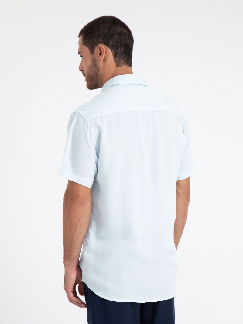 A mistura de Viscose com Linho cria um tecido que equilibra rusticidade e fluidez. Camisa com fechamento frontal por botões na cor do tecido e mangas curtas. Tecido teve, toque macio, respirável e modelagem tradicional.