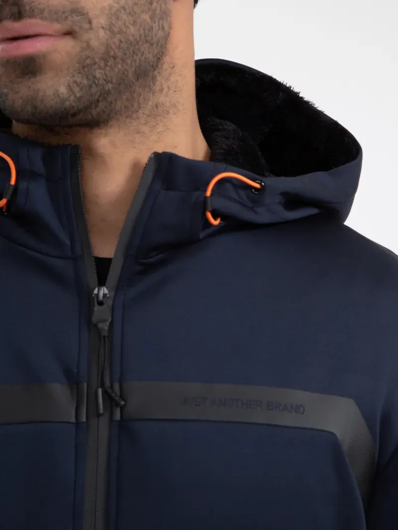 Possui capuz, mangas longas, rib Nãos punhos das mangas, bolsos frontais com fechamento por zíper, detalhe frontal com logo na altura do tórax, ajustadores em cor laranja Não capuz e fechamento frontal por zíper selado.